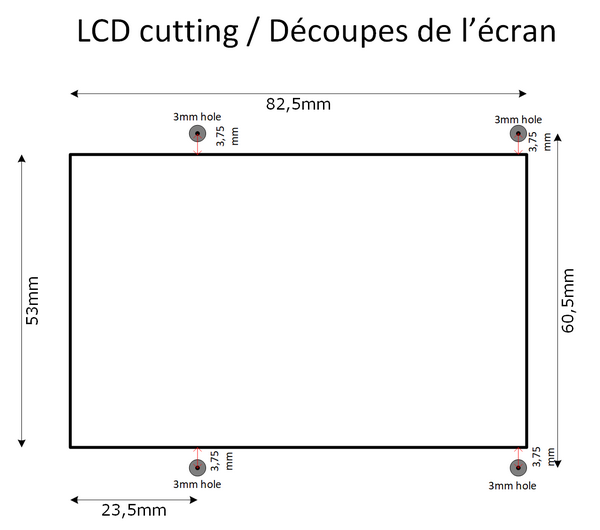 Il faut réaliser la découpe pour l’écran à cristaux liquide (82,5x53mm). On peut découper un peu plus grand même si ce n’est pas super précis.