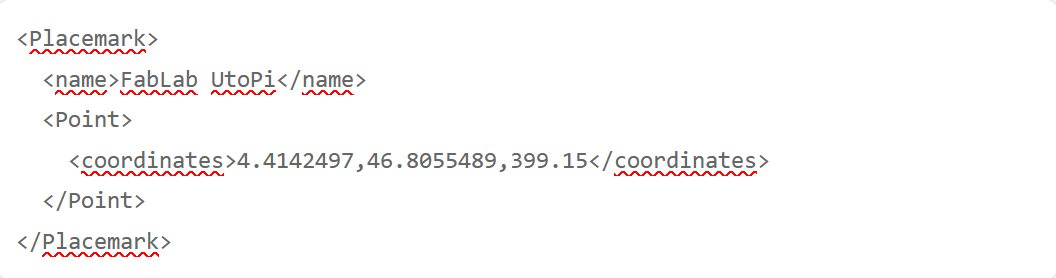 Le fichier .kml généré par Google Earth Web est un simple fichier texte structuré, lisible et standardisé. On y retrouve d’abord le nom du projet (ici FabLabUtoPi), puis l’ensemble des repères (Placemark) créés sur la carte, chacun avec son nom, ses coordonnées géographiques précises (latitude, longitude et altitude) et les paramètres de vue associés.