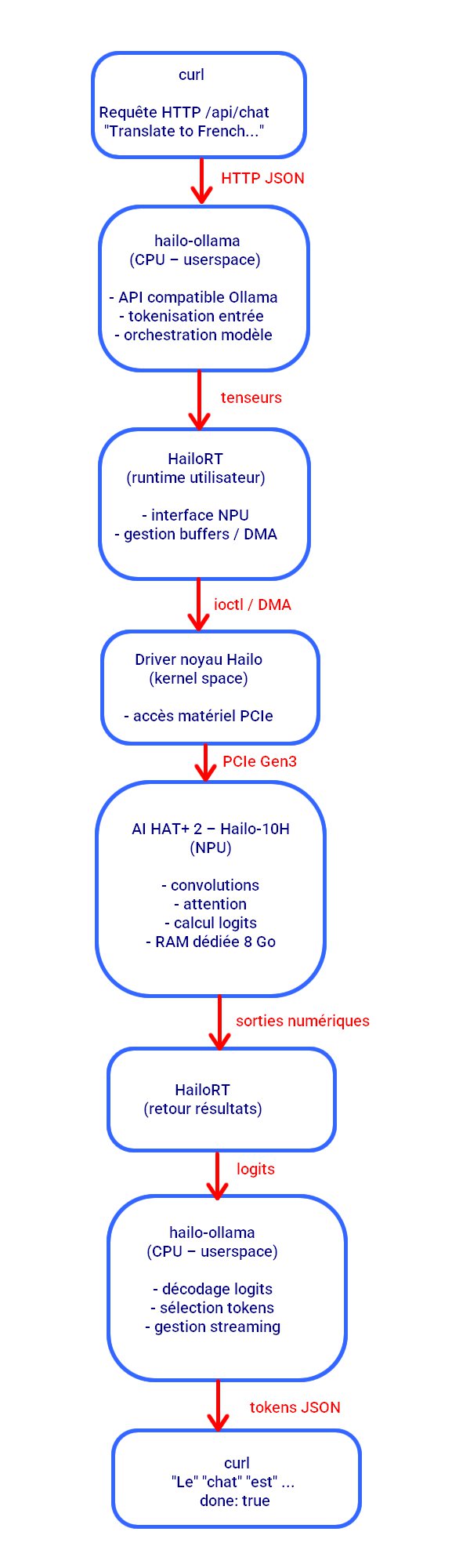Cette approche permet aussi de voir clairement quelles dépendances sont utilisées et de mieux comprendre l’architecture logicielle (HailoRT, serveur d’inférence, API Ollama). C’est particulièrement utile dans un contexte d’expérimentation ou de rédaction d’un article technique.