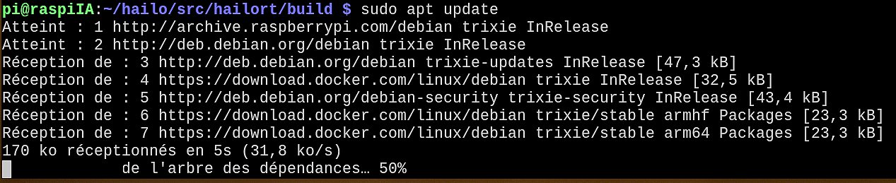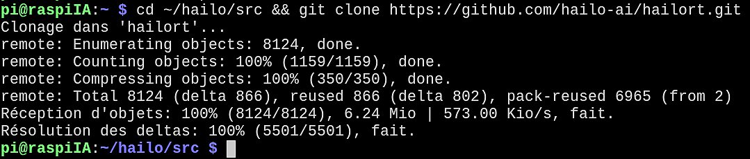 HailoRT (Hailo Runtime) est la couche logicielle qui permet au système d’exploitation de dialoguer avec l’accélérateur IA Hailo présent sur l’AI HAT+ 2. Elle fournit les bibliothèques, les services et les outils nécessaires pour charger des modèles, gérer les échanges de données et piloter l’exécution des inférences sur le NPU. Sans HailoRT, la carte Hailo n’est pas exploitable par les applications. L’installer et le compiler depuis les sources permet de garantir une compatibilité optimale avec la version du noyau et de Debian utilisée, tout en évitant les problèmes parfois rencontrés avec des paquets précompilés.