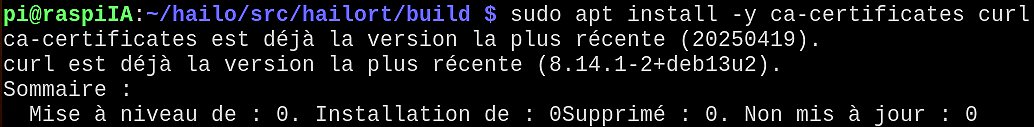 À la date d’écriture de cet article (décembre 2025), la documentation officielle annonce HailoRT 4.23 comme version de référence pour Raspberry Pi OS Trixie via l’installateur unifié hailo-all. Dans cet article, certaines briques (HailoRT, Hailo-Ollama) ont été compilées depuis les sources GitHub afin de documenter finement la chaîne logicielle et valider le  fonctionnement bas niveau de la carte. Les deux approches sont compatibles, la méthode unifiée simplifiant désormais l’installation pour la majorité des utilisateurs.