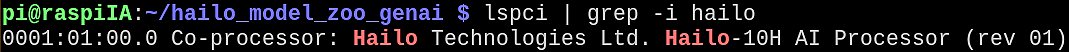 Une ligne mentionnant Hailo apparaît, cela confirme que la carte est bien détectée par le système. Cette commande ne dépend d’aucun driver spécifique, c est une commande standard Linux.