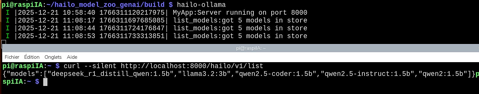 La pile LLM fournie par Hailo s’appuie sur un service appelé hailo-ollama. Ce service joue le rôle de serveur d’inférence local : il expose une API compatible Ollama, capable de charger des modèles LLM optimisés pour le Hailo-10H et de traiter les requêtes entièrement en local, sans passer par le cloud.