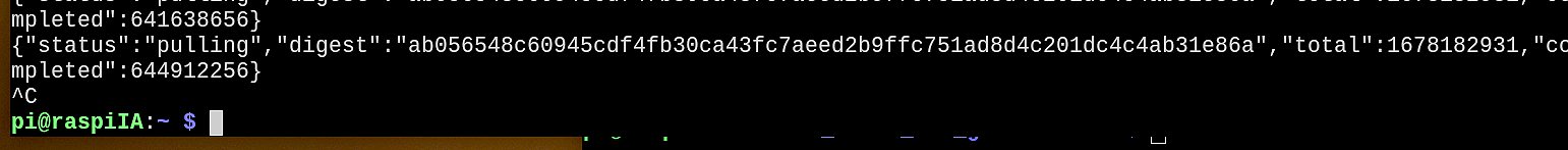Ce qu’on obtient ({« status »: »pulling », …}) est normal : le serveur télécharge le modèle en morceaux et renvoie une progression. Ici j’ai interrompu le chargement par CTRL + C ! Laissez le chargement se poursuivre jusqu’à la fin. On voit que le modèle pèse 1,68 Go environ ! Le serveur est en train de télécharger le modèle sur Internet depuis le dépôt Hailo. Il sera stocké localement. L’empreinte cryptographique (hash) du modèle sert à vérifier l’intégrité des données (vérifier que le modèle n’est pas corrompu) … Patientez jusqu’à …