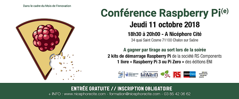Semaine Raspberry Pi avec une conférence à Nicéphore Cité (Chalon-sur-Saône) jeudi 11 octobre 2018 à 18h30 et 3 jours au Village des Sciences le week-end prochain, pour montrer les possibilités de la framboise !