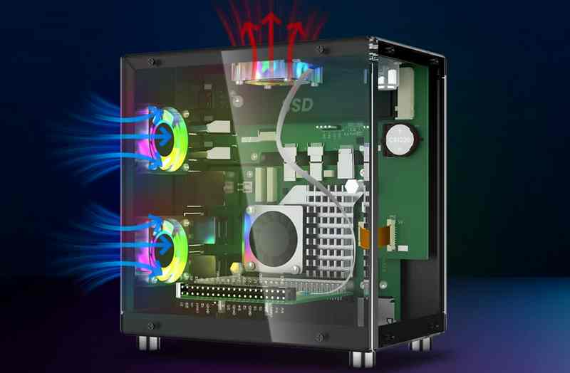 Trois ventilateurs intégrés assurent un flux d’air constant. Cela permet de maintenir la température des processeurs et du SSD à un niveau raisonnable, même lors d’applications gourmandes (calcul IA, traitement multimédia, serveur en continu). Il faut prendre en compte que les 4 ventilateurs (3 sur le boîtier + un sur le Pi5) produisent un léger bruit. On verra lors du vieillissement des ventilateurs, mais parfois des bruits mécaniques apparaissent 😉