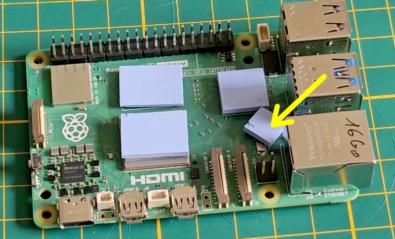 La pose des pads thermiques. Je ne suis pas certain que le carré posé sur le transceiver Ethernet (flèche jaune) soit très utile. D’une part parce que ce n’est pas le composant qui chauffe le plus… d’autre part parce que le radiateur ne vient pas le recouvrir complètement et n’appuie pas très fort dessus. Mais j’ai respecté le montage indiqué sur la notice.