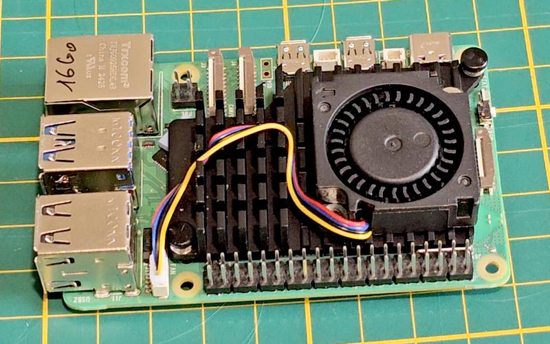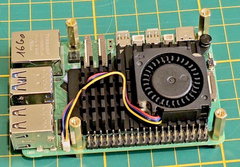 On peut ensuite clipser le radiateur sur le Pi5 et connecter sa prise 3 broches sur le connecteur FAN du Pi5. Le PWM assure un refroidissement adapté et surtout, vous pouvez régler les seuils de déclenchement et les différentes vitesses du ventilateur en fonction de la température du CPU. Cela permet de garder le Raspberry Pi 5 à une température raisonnable même lorsque il est fortement sollicité.