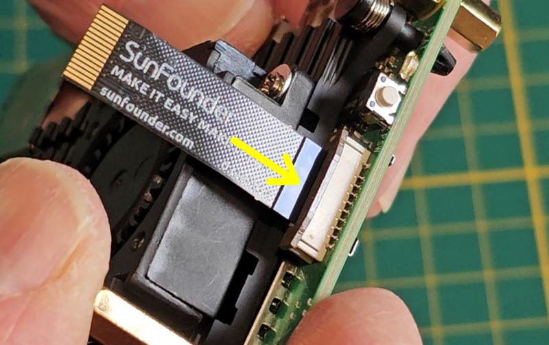 Sur la carte SunFouder, soulevez le verrou de la prise PCIe, puis introduisez la nappe bien à fond et bien perpendiculairement (flèche jaune) puis abaissez le verrou pour bloquer la nappe.