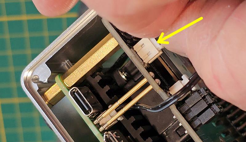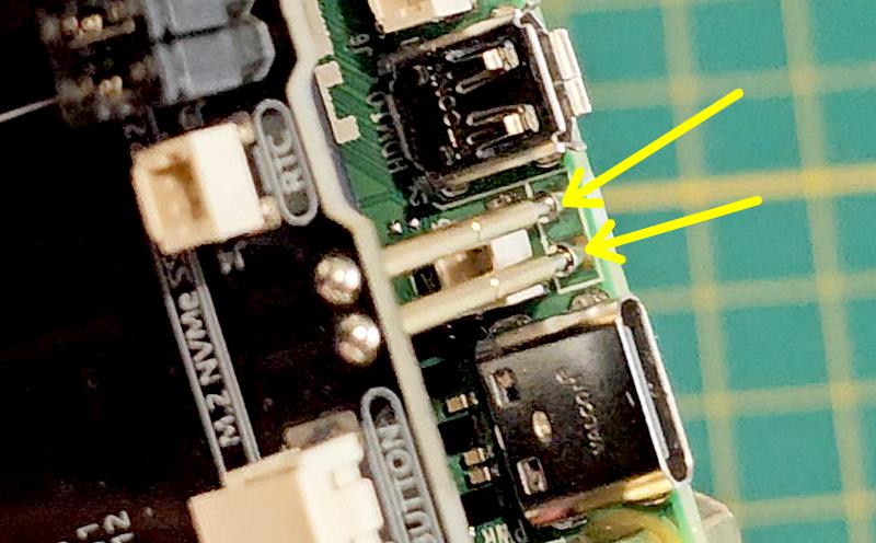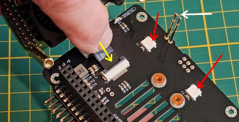La flèche blanche indique les contacts à ressort qui viendront se positionner sur les contacts positionnés à côté de la prise USB C d’alimentation. Ces contacts sont ceux du bouton poussoir A/M qui est sur la carte. Ils permettent le démarrage ou l’arrêt du système et sont gérés nativement par Raspberry Pi OS BookWorm.
