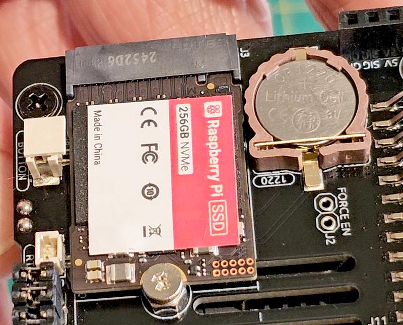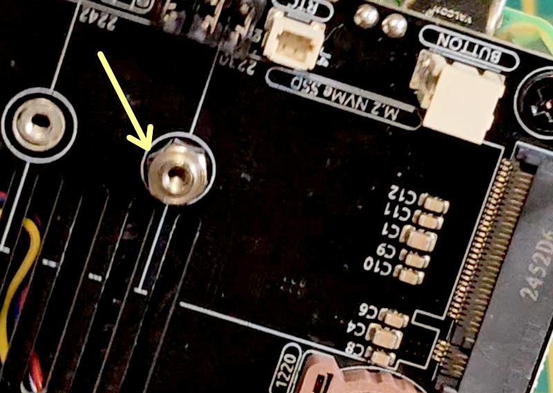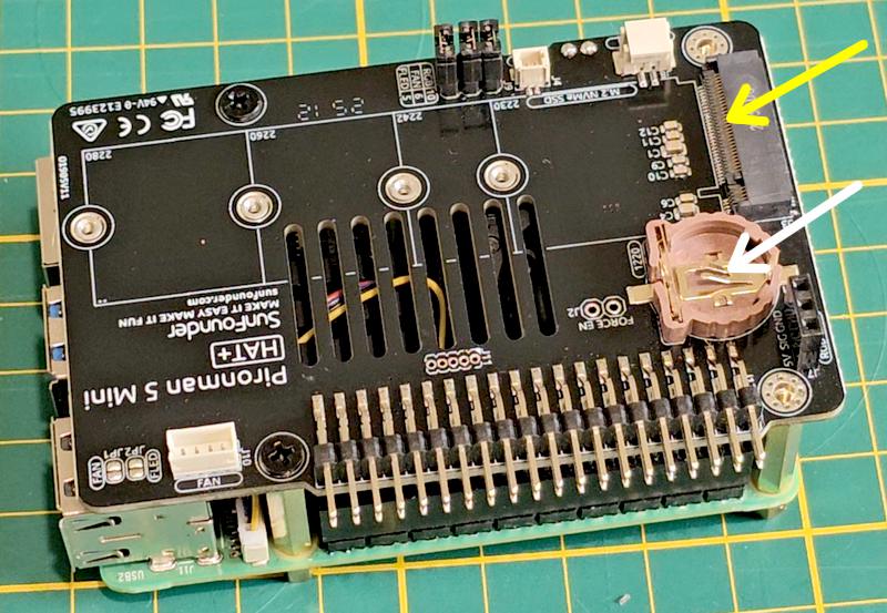 La carte est fixée par 4 vis, sur les entretoises longues. La flèche jaune indique le connecteur M2 pour un SSD NVMe, et la flèche blanche montre l’emplacement de la pile de maintien de l’heure pour la RTC (horloge « garde temps » du Raspberry Pi 5). Elle permet de redémarrer le Pi 5 non connecté au réseau tout en gardant l’heure réelle.