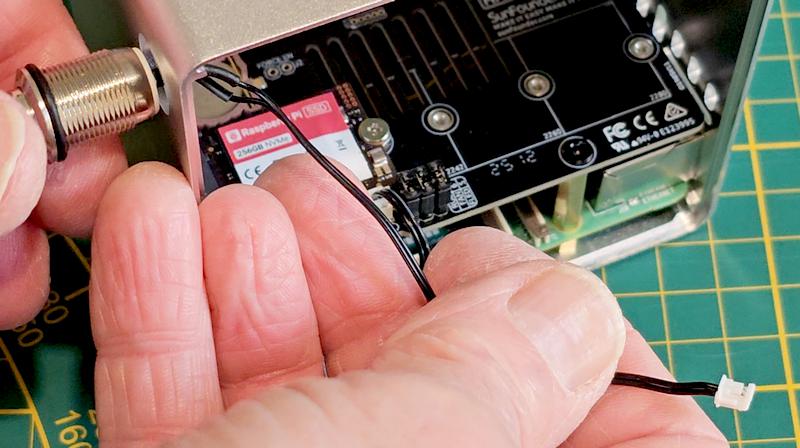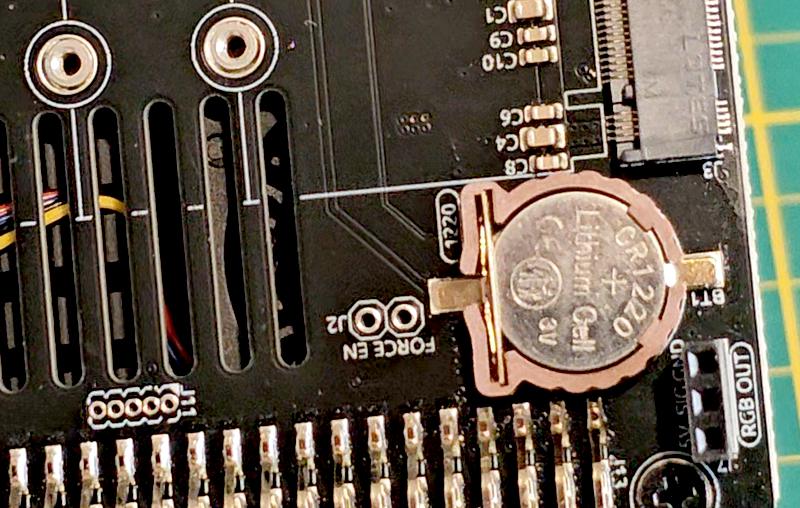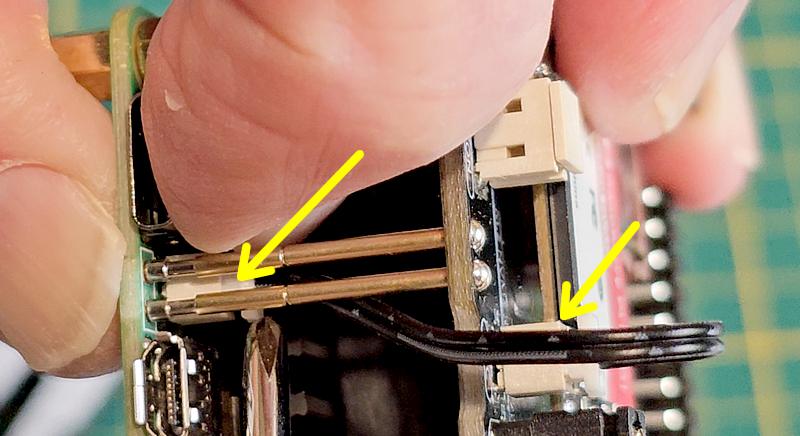 On peut mettre en place le câble de la RTC (flèches jaunes). Il ramène la tension de la pile CR1220 depuis la carte supérieure jusqu’au Raspberry Pi. Bon, la prise est derrière les connecteurs à ressort et je m’en suis vu, avec mes gros doigts pour aller la connecter. J’ai dû utiliser une petite pince pour la connexion…