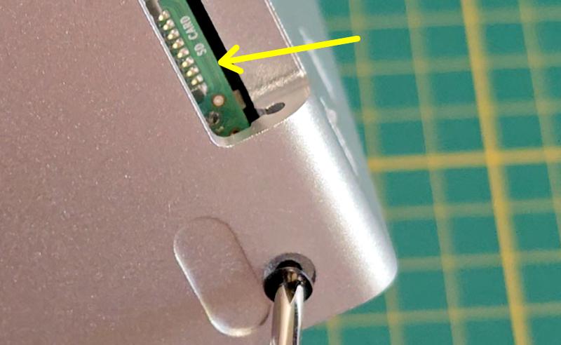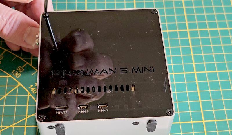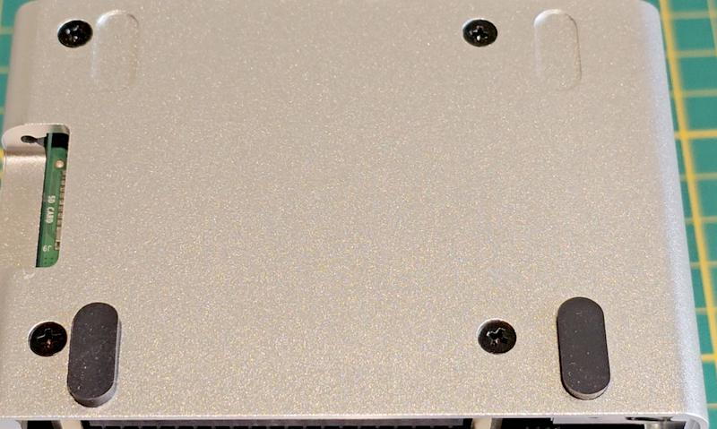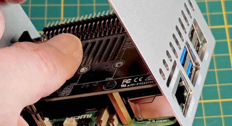 On peut maintenant fixer le Pi5 au boîtier grâce à 4 vis. En bas de la face avant on a accès à l’emplacement de la carte SD, peu utile si vous utilisez un SSD, mais pratique pour les makers qui ont besoin de changer régulièrement d’OS.