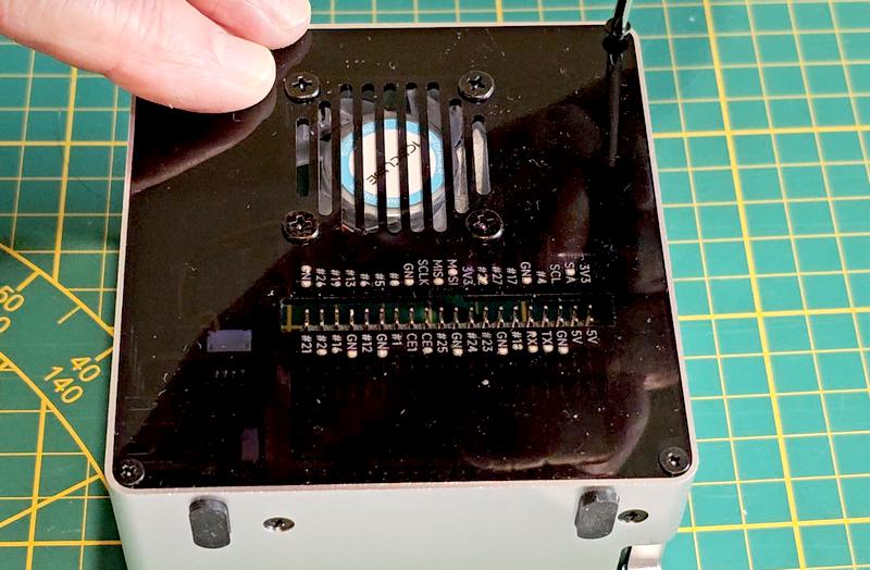 Glisser ensuite le Pi5 en place en introduisant les connecteurs Ethernet et USB dans les trous à l’arrière du boîtier.