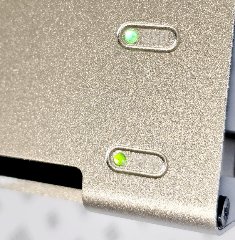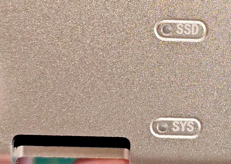 En face avant 2 indicateurs montrent l’activité du système et l’accès au SSD. ce sont des guides de lumière positionnés en face des LEDs.