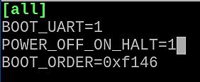 <span class="nv">BOOT_UART</span><span class="o">=</span><span class="m">1</span> <span class="nv">POWER_OFF_ON_HALT</span><span class="o">=</span><span class="m">1</span> <span class="nv">BOOT_ORDER</span><span class="o">=</span>0xf146 |
