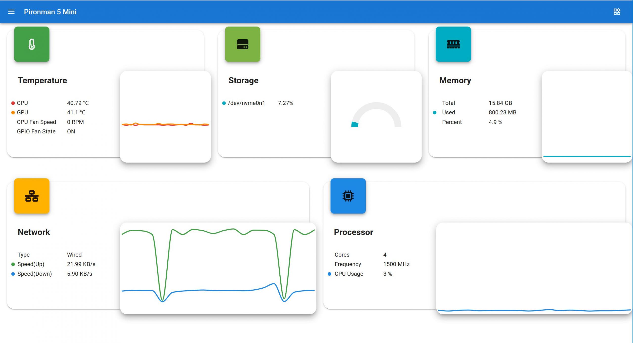 Le boîtier Pironman 5 Mini embarque un service Web complet qui permet de surveiller en temps réel l’état du Raspberry Pi 5 : températures, utilisation CPU, mémoire, stockage, réseau et ventilation.