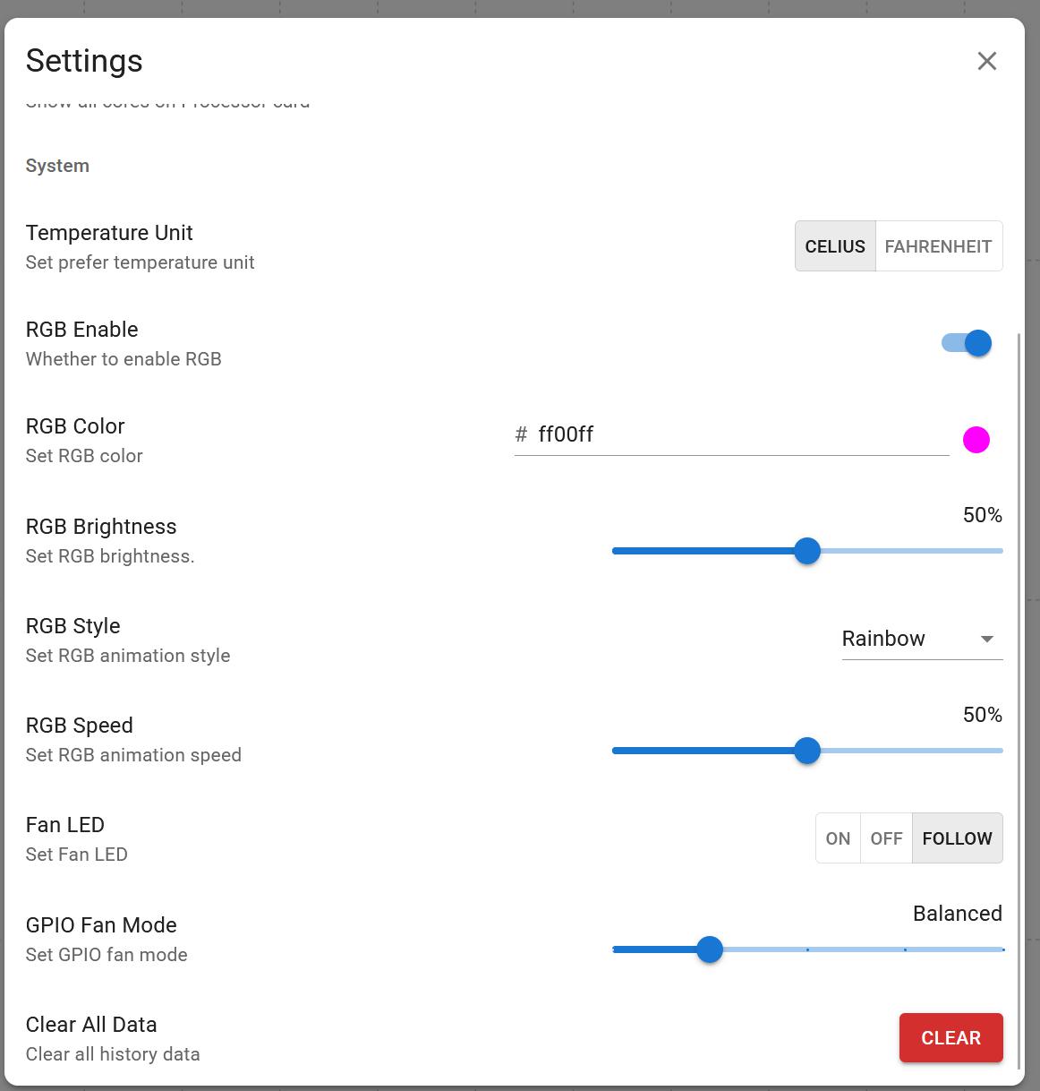 Outre la visualisation, le tableau de bord permet également de contrôler certains éléments (ventilateur, LED RGB, seuils de température, etc.). (icône en haut à droite)