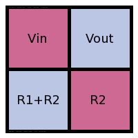 En cachant Vout, par la méthode graphique, il reste Vin et R2 de la même couleur. On les multiplie donc. R1+R2 a une couleur différente : on divise donc par R1+R2.